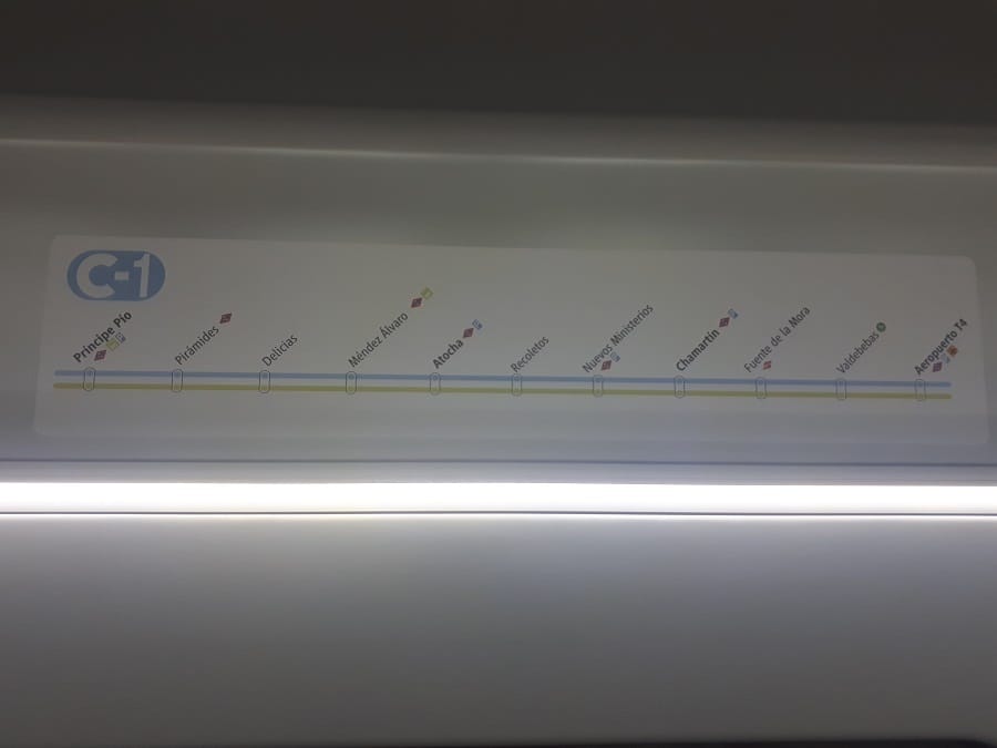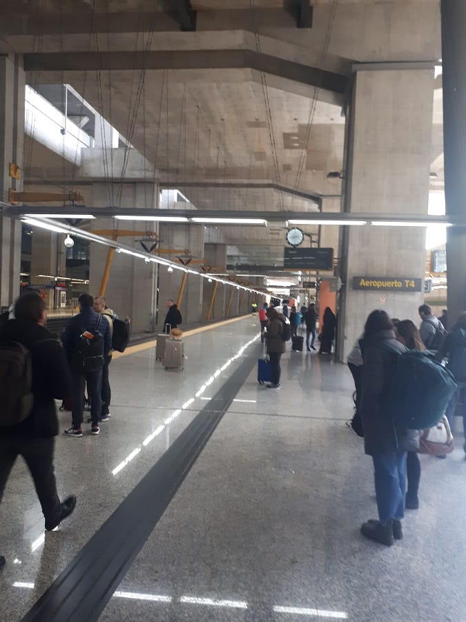 Atocha veya Chamartin tren istasyonlarına, C1 ve C10 olmak üzere iki tren hattından birini kullanarak ulaşabilirsiniz. Trenle, T4 Havalimanı’ndan Chamartín İstasyonu yaklaşık 19 dakika, Atocha İstasyonu yaklaşık 33 dakika ve Príncipe Pío’ya ise yaklaşık 45 dakika sürüyor. T4 Terminali Havalimanında diğer terminallerden epey uzak bir noktada, bu nedenle T4 e ulaşım için ücretsiz havalimanı servislerini kullanmanızı öneririm.